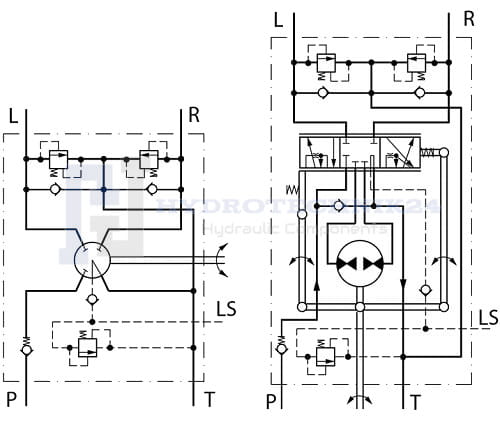 - Orbitrol 160 mit dem LS-System (LOAD SENSING), bei stehendem Lenkrad wird der Ölfluss durch das Orbitrol geschlossen, das Orbitrol hält dann den Druck im System. Das LS-System signalisiert der Pumpe jedes Mal, wenn das Lenkrad bewegt wird.