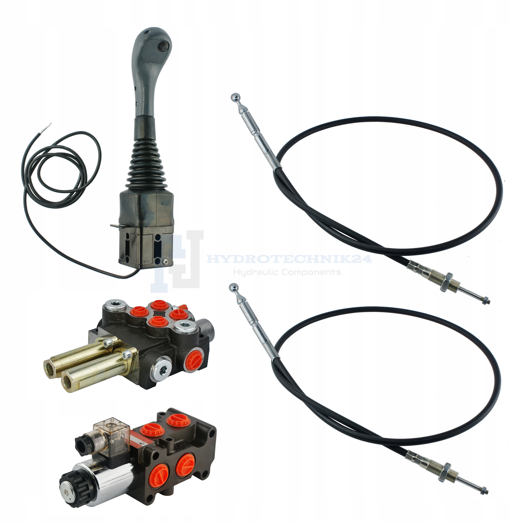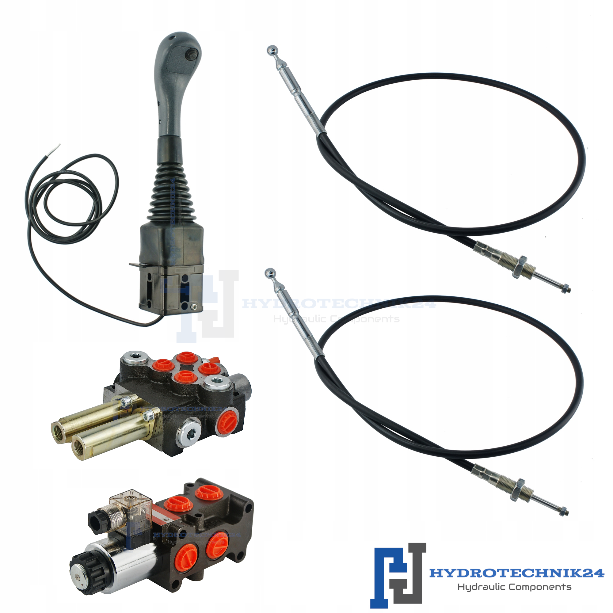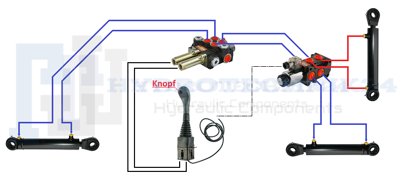 Handsteuerventil 40L/min 2-Fach 2xDW + Joystick 1 Knopf + 2x Bowdenzüge + Umschaltventil 6/2 12V