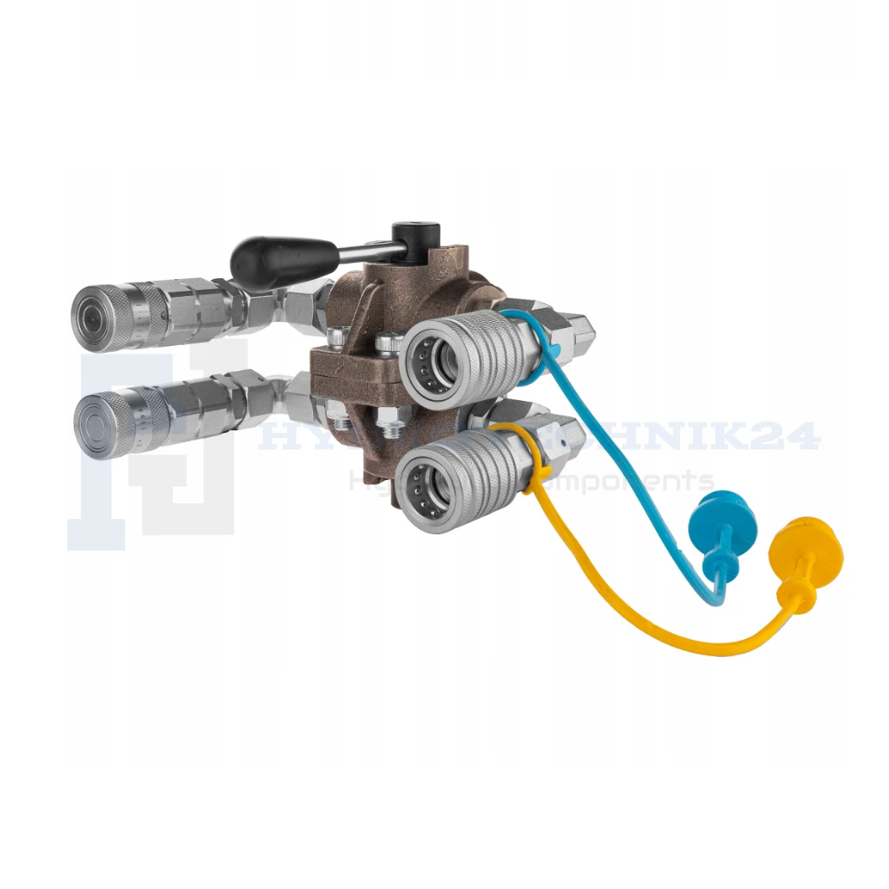 Kompletter Verteiler mit Kugelhahn und Schnellkupplungen, der es ermöglicht, eine einzelne hydraulische Versorgungsleitung zwischen vier Ausgangsleitungen umzuschalten. Er wird verwendet, um Land- und Industriemaschinen zu steuern, wenn nur eine Energiequelle vorhanden ist, die Maschine jedoch über vier Hydraulikverbraucher verfügt, die nicht gleichzeitig arbeiten.
