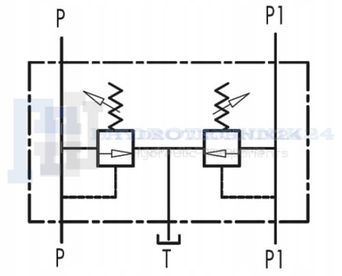 - Mit einem Doppelventil können Sie den maximalen Druck auf zwei unabhängigen Hydraulikleitungen steuern. Beide Leitungen haben nur eine gemeinsame Rücklaufleitung (Überlauf).