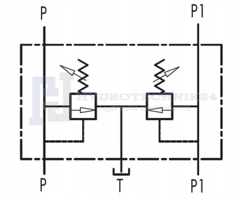 - Mit einem Doppelventil können Sie den maximalen Druck auf zwei unabhängigen Hydraulikleitungen steuern. Beide Leitungen haben nur eine gemeinsame Rücklaufleitung (Überlauf).