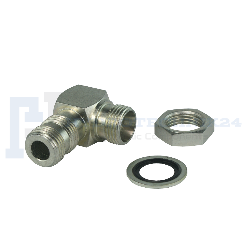 - Metrischer Hydraulikanschluss mit Dichtung, eingeschraubt in das Gehäuse der Pumpe, des Zylinders, des Hydraulikverteilers. Verbindet die Pumpe, Zylinder, Verteiler etc. mit Hydraulikleitungen. Kommt mit einer Überwurfmutter und einer Dichtung. Durch den abgewinkelten Hydraulikanschluss kann der Hydraulikschlauch näher am Pumpenkörper oder Zylinder geführt werden. Wird dort verwendet, wo der Platz begrenzt ist und die Schnur mit dem Knie nicht passt